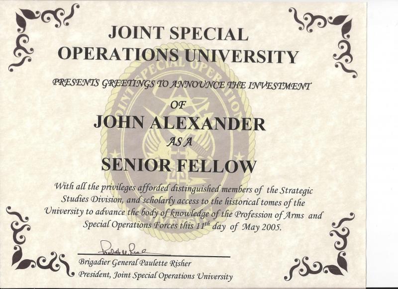 Dr. Alexander organized and chaired six major conferences on non-lethal warfare and served as a US delegate to several NATO studies on the topic. As a member of the first Council on Foreign Relations non-lethal warfare study, he was instrumental in influencing the report that is credited with causing the Department of Defense to create a formal Non-Lethal Weapons Policy in July 1996. He was a distinguished guest lecturer at several DOD universities and has advised the CIA, US Special Operations Command, and the National Intelligence Council.